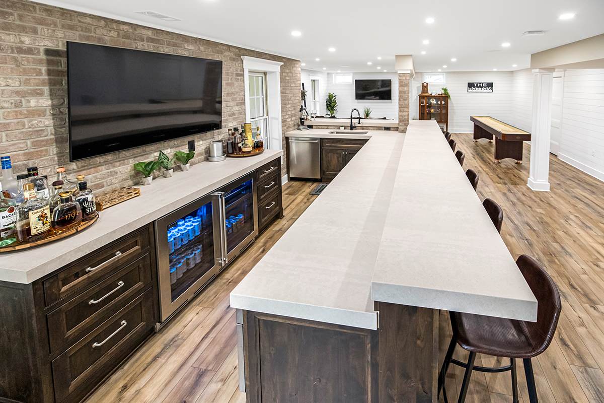 The homeowners in Shorewood, Wisconsin, aimed to fully renovate their basement into a personalized space. Their vision was to transform it into an expansive entertainment zone, complete with sports screens, ample bar seating, areas designated for future bistro tables, and a cozy spot for a large family and numerous friends to enjoy TV together. To enhance the ambiance, they installed a collection of home bar cabinets, elevating the basement to the level of a high-quality pub and inspiring innovative bar cabinet designs.